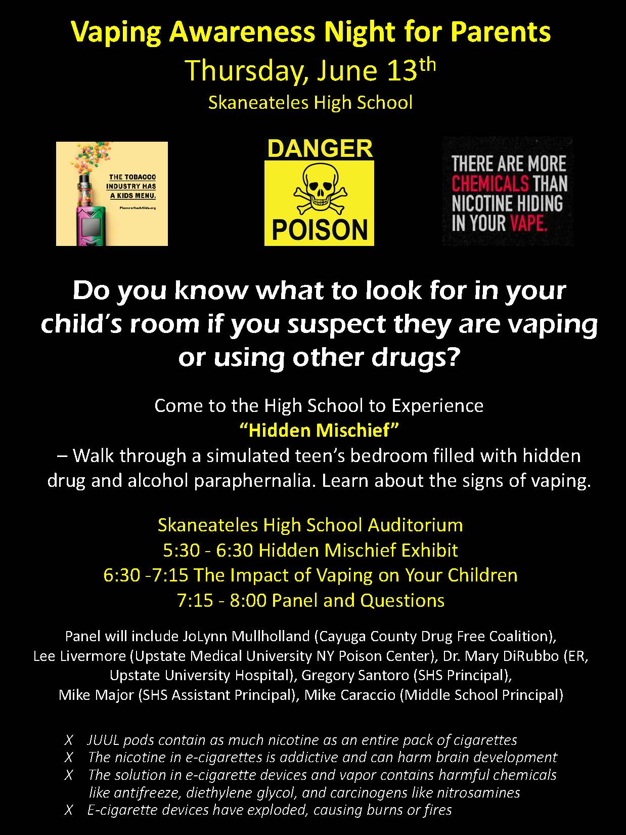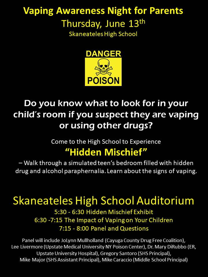 Tomorrow evening, beginning at 5:30 pm, parents will have the opportunity to learn more about the dangers of vaping and other drugs. First, parents can walk through the Hidden Mischief Room any time from 5:30-6:30. This experience will take approximately 15 minutes.Then at 6:30, experts in the field of teen drug abuse will present on the topic: “What You Don’t Know CAN Hurt Your Child: The Facts and Myths of Vaping and Substance Abuse.”